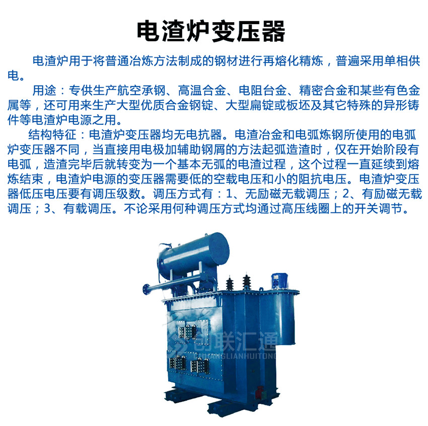 電渣爐變壓器電渣爐變壓器均無(wú)電抗器,專供生產(chǎn)航空承鋼、高溫合金、電阻臺(tái)金、精密合金和某些有色金屬等,還可用來(lái)生產(chǎn)大型優(yōu)質(zhì)合金鋼錠、大型扁錠或板坯及其它特殊的異形鑄件等電渣爐電源之用。